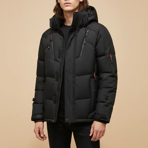 Denne herrejakke er udformet som en midjelang dunjakke med quiltet yderside og fast hætte. Modellen er beregnet til daglig brug i kolde perioder og kan anvendes både til arbejde og fritid. Den rette silhuet og den neutrale mørke farve gør jakken nem at kombinere med forskellige typer beklædning.